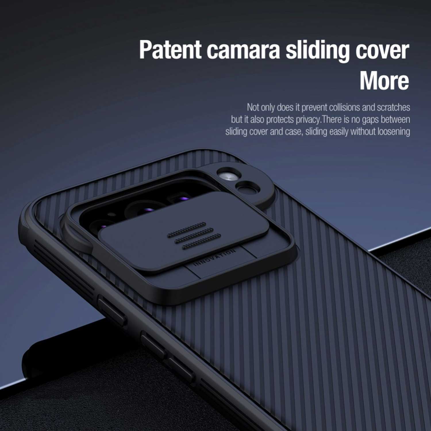 O Nillkin CamShield para o Google Pixel 9 Pro cobre as três câmaras traseiras - principal, ultra-larga e teleobjetiva - com um único mecanismo deslizante. Fica nivelado quando aberto e cobre totalmente o módulo da câmara quando fechado.