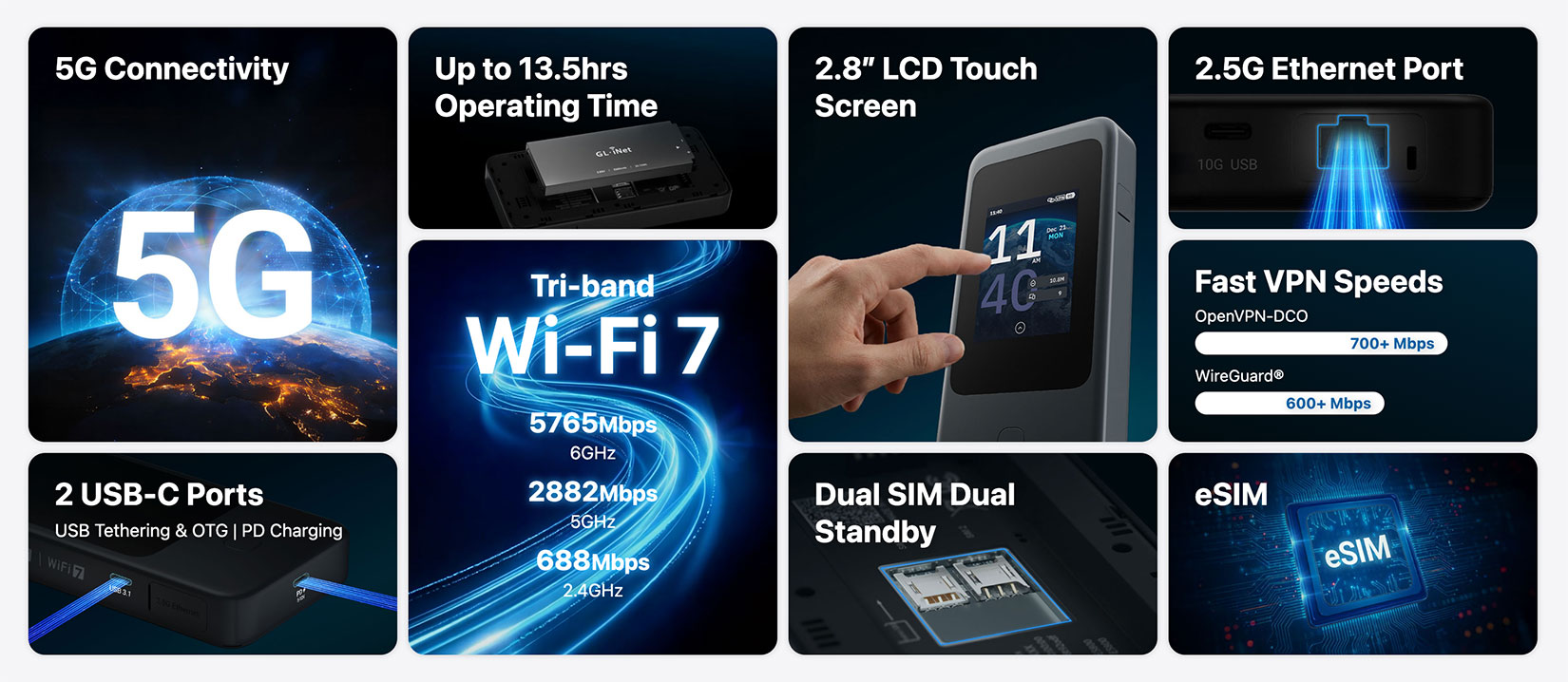Mudi 7 5G NR Tri-band Wi-Fi 7 Travel Router
